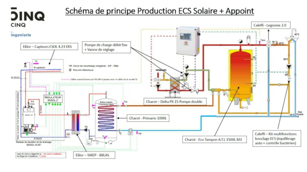 La production ECS est assurée par une production solaire prioritaire, couplée à un appoint calorifique provenant de la sous-station. Ce système limitera les consommations énergétiques produites en sous-station tout en assurant une température de départ ECS confortable.