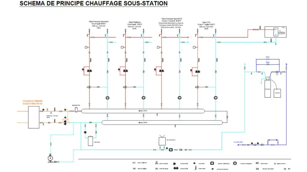 La production de chaleur de la sous-station est issue du réseau urbain géré par le concessionnaire. Un collecteur A/R distribue par la suite 4 réseaux composés de 3 circuits régulés et un circuit constant :